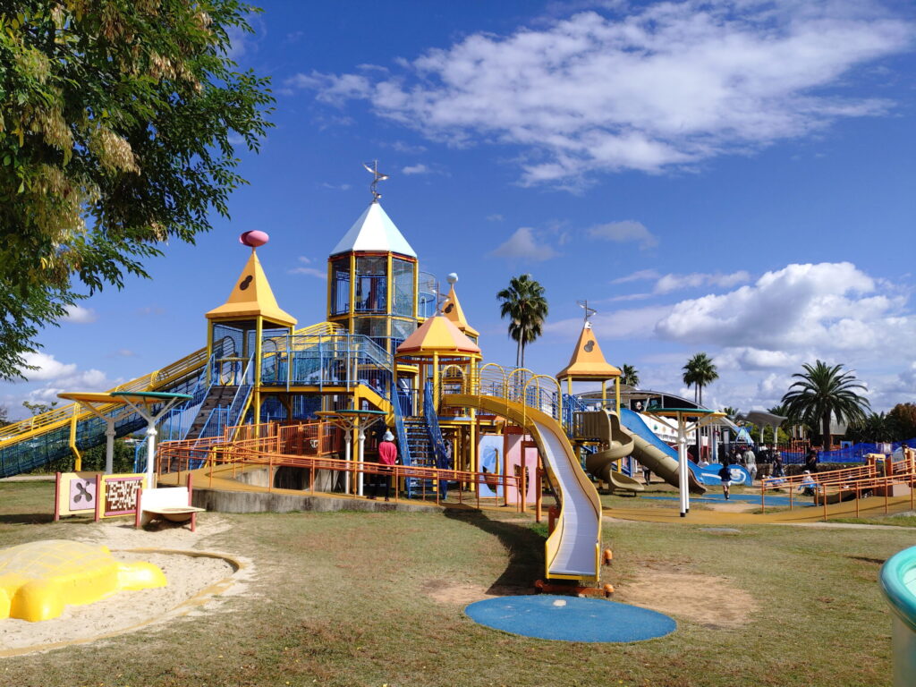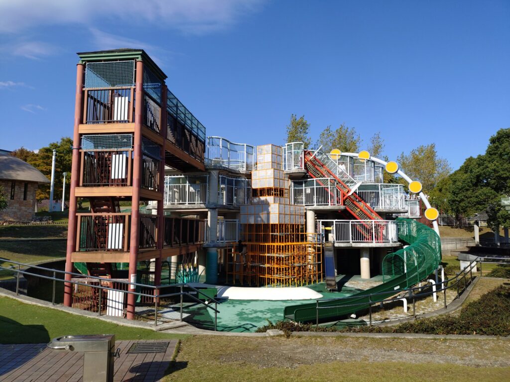 こちらの大型遊具は本当に大きくて、滑り台も何本もあるし、ターザンロープもあるし、子どもたち大満足です。